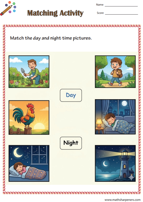 Help children learn about day and night with fun and engaging worksheets. These Day and Night worksheets are perfect for kindergarten and Grade 1 students to understand the difference between daytime and nighttime through simple activities and pictures.